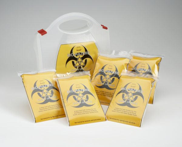 Biohazard Kit – 5 Treatment Packs Body Fluid Disposal & Containment System: For the safe and effective handling, containment, disinfection and disposal of infectious micro-organisms contained in blood, vomit, urine, mucus, faeces and semen.