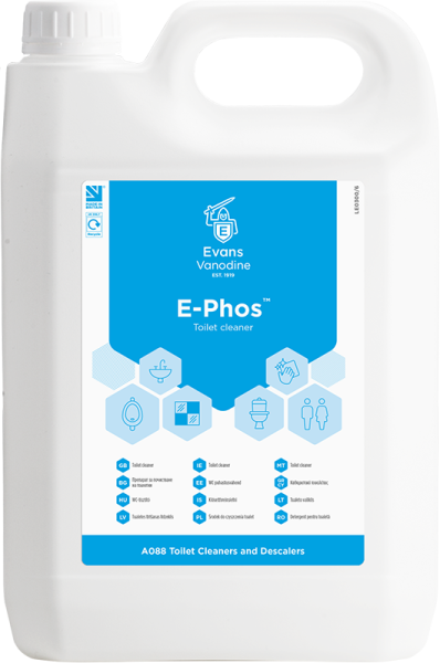 Evans Vanodine E-Phos Phosphoric Acid Toilet & Washroom Cleaner is a highly effective multi-purpose cleaning solution specifically designed for use in toilets, urinals, washbasins, showers, and tiled surfaces.